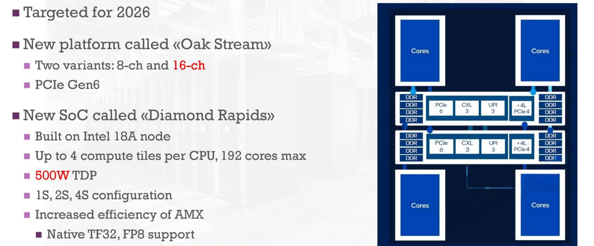 Oak Stream выйдет в 2026 году и обеспечит поддержку как 8, так и 16 каналов памяти, а также шины PCIe Gen6. Что касается процессоров Diamond Rapids, то будет до четырех чиплетов по 48 ядер. Соответственно, в топовом процессоре будет 192 ядра. Максимальное потребление составит 500 Вт. Конфигурации сокетов — один, два или четыре. Сообщается, что Diamond Rapids будут производиться по техпроцессу Intel 18A.