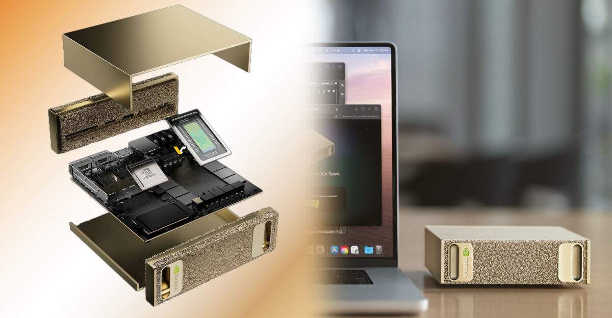 Устройство называется DGX Spark. Это всё тот же мини-ПК габаритами всего 150 х 150 х 50,5 мм, который при этом оснащён чипом Grace Blackwell (GB10 SuperChip). В его конфигурацию входят 20-ядерный процессор (10 ядер Cortex-X925 и 10 ядер Cortex-A725) и GPU на архитектуре Blackwell, характеристики которого не раскрываются. Известно, что производительность в задачах ИИ (FP4) достигает 1 PFLOPS.