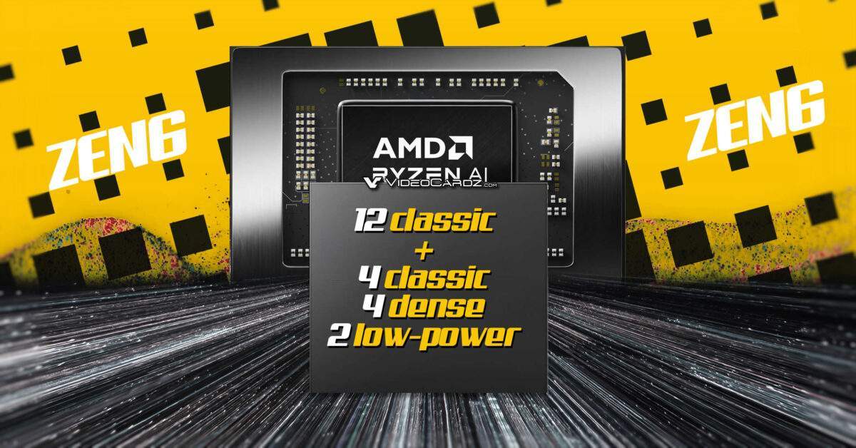 Младшие Ryzen 5 и Ryzen 7 будут иметь привычный по мобильным чипам монолитный кристалл, но вот его конфигурация явно нетипична для AMD. Сообщается о четырёх обычных ядрах Zen 6, четырёх Zen 6c и двух ядрах LP (Low Power). Как они будут называться, неясно, но можно предположить, что Zen 6LP или Zen 6L. Сейчас у AMD нет ни малых ядер, как у Intel, ни тем более таких вот ядер LP. Такие APU также получат iGPU с 512 потоковыми процессорами на основе архитектуры RDNA 3.5+. То есть подтверждаются недавние данные о том, что архитектуру RDNA 4 по каким-то причинам в процессорах AMD мы пока не увидим.