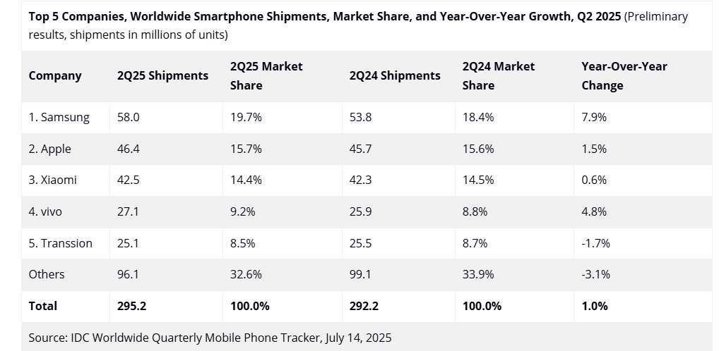 Также в пятёрку лучших входит Vivo и Transsion, которой принадлежат бренды Tecno и Infinix, но она единственная среди лидеров, кто зафиксировал спад продаж (на 1,7%).