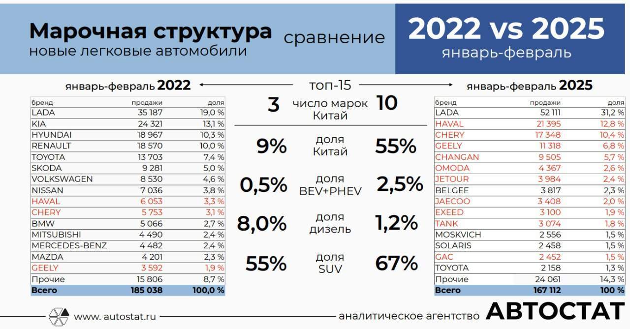 «Автостат» привел интересный слайд, позволяющий сравнить марочную структуру российского авторынка в 2022 году и в 2025 году. Хорошо видно, что все перевернулось с ног на голову: некогда хитовые Kia, Hyundai и Renault вылетели из топ-15. Фото: Автостат Теперь рынком правят китайцы. Единственное, что осталось неизменным — это первое место Lada, и отечественный бренд серьезно нарастил […]